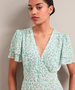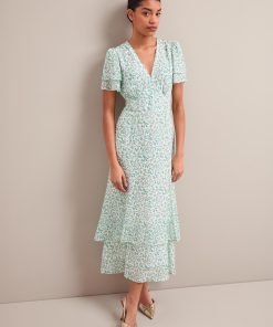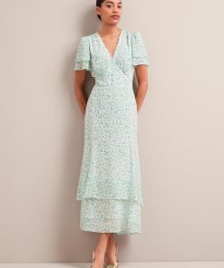 Lotta Gold Metallic Fil Coupé Maxi Dress – Green Yellow Trailing Feather Print